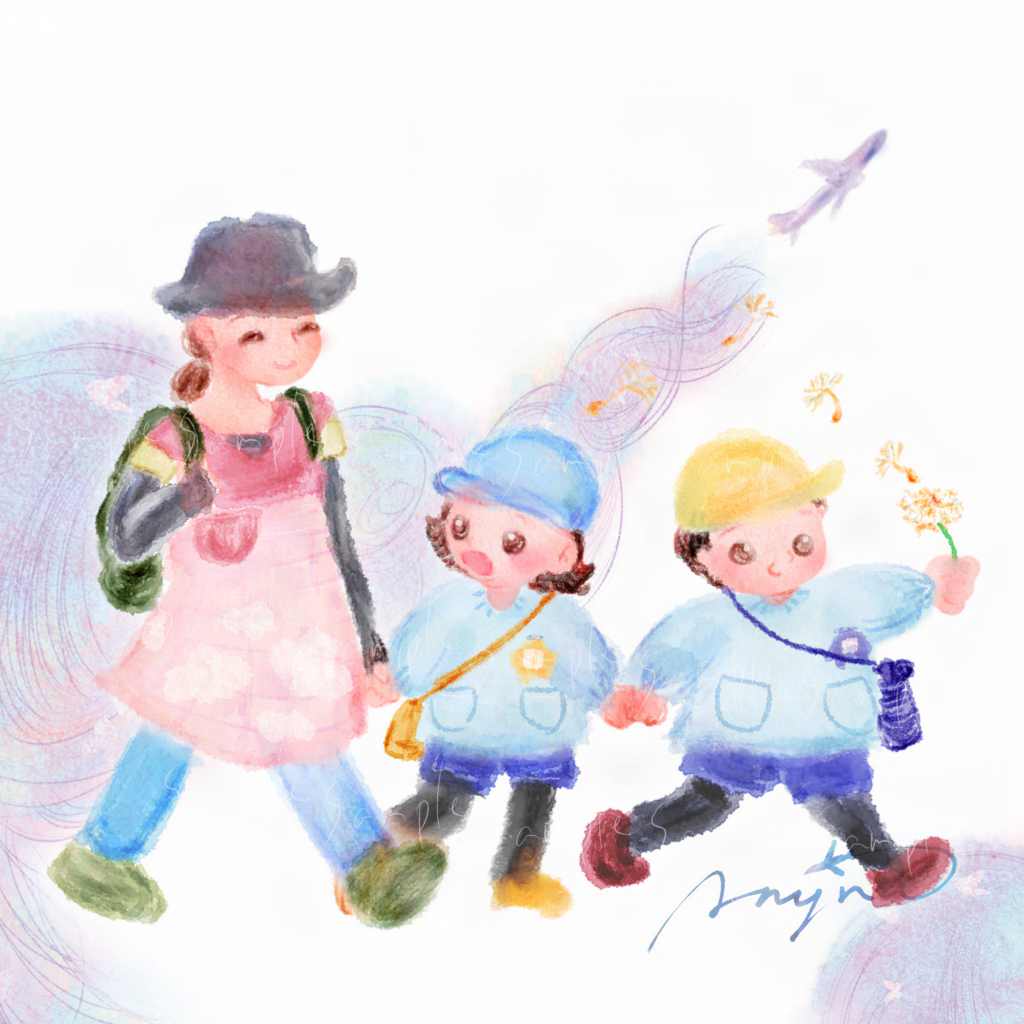 水彩風の柔らかいタッチで、人物・動物・食べ物・植物などを描いたサンプルです。